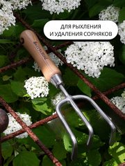 Эргономичная деревянная ручка удобно лежит в руке, снижая нагрузку во время работы. При длине всего 25 см, он идеально подходит для обработки грядок, клумб и небольших участков, где требуется точность.