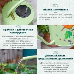 Легкий вес (всего 400 грамм) и вместимость в 2 литра позволяют поливать растения без лишних усилий. Длинный тонкий носик обеспечивает точный полив, а эргономичная ручка удобно лежит в руке.