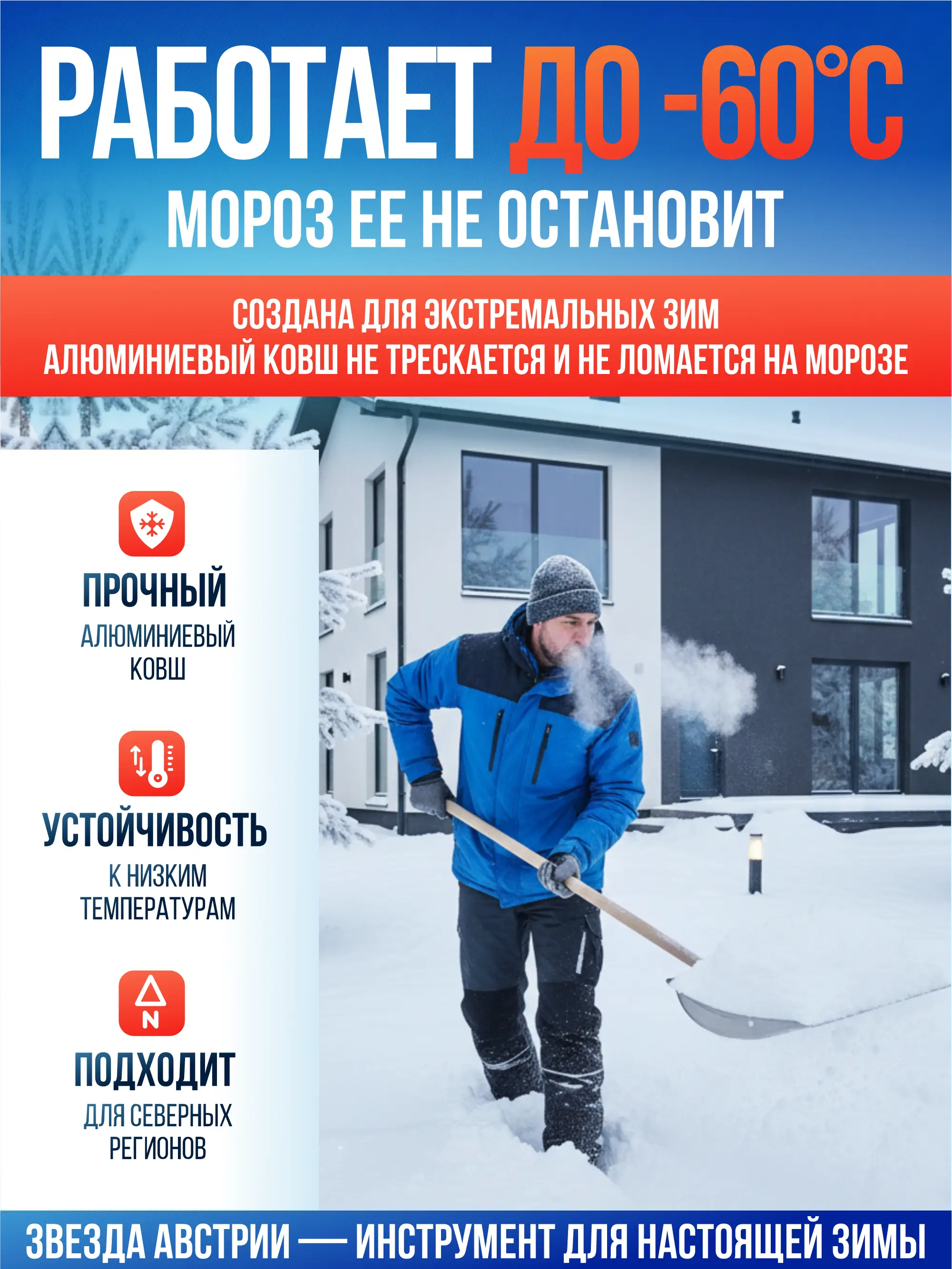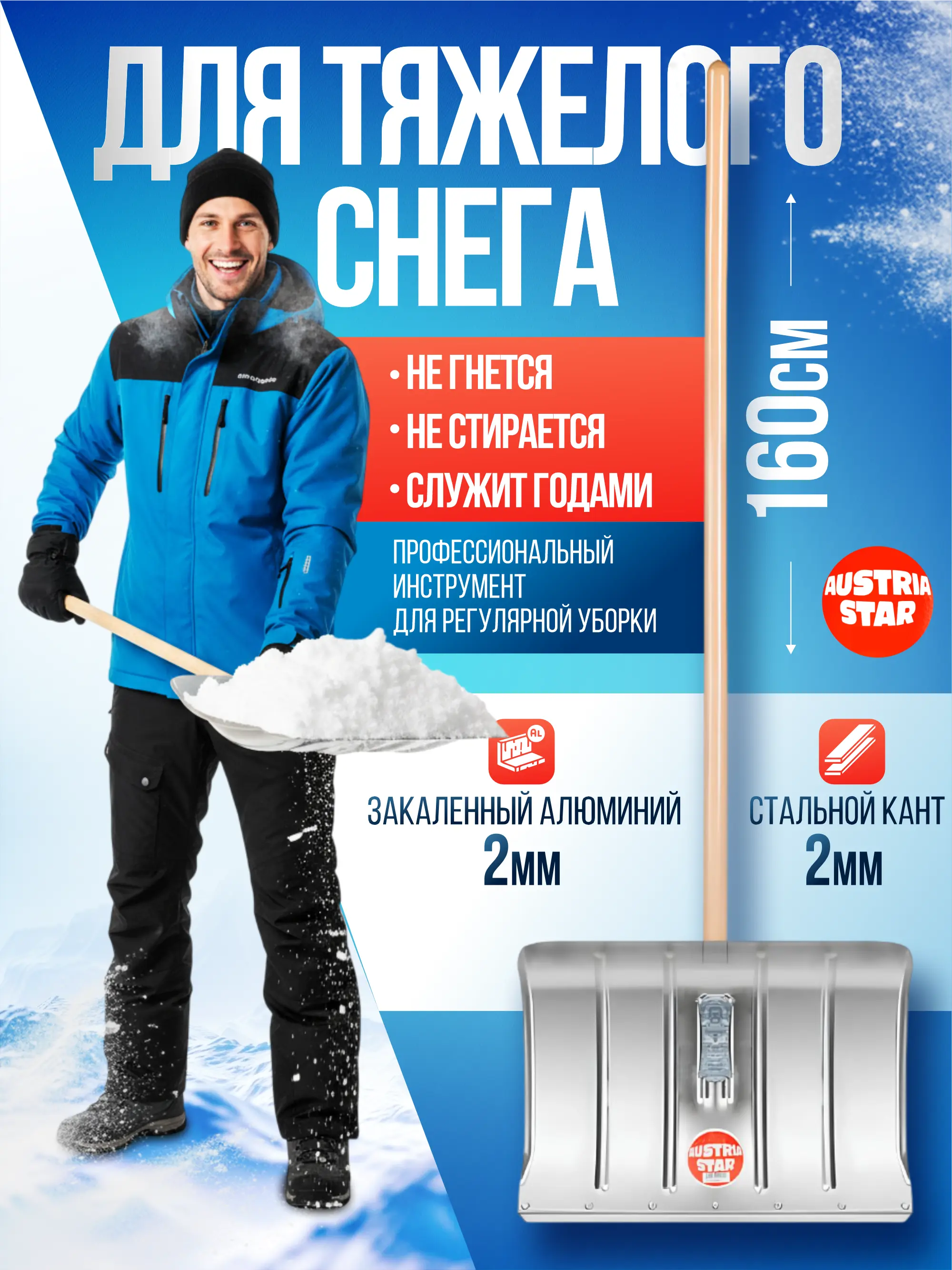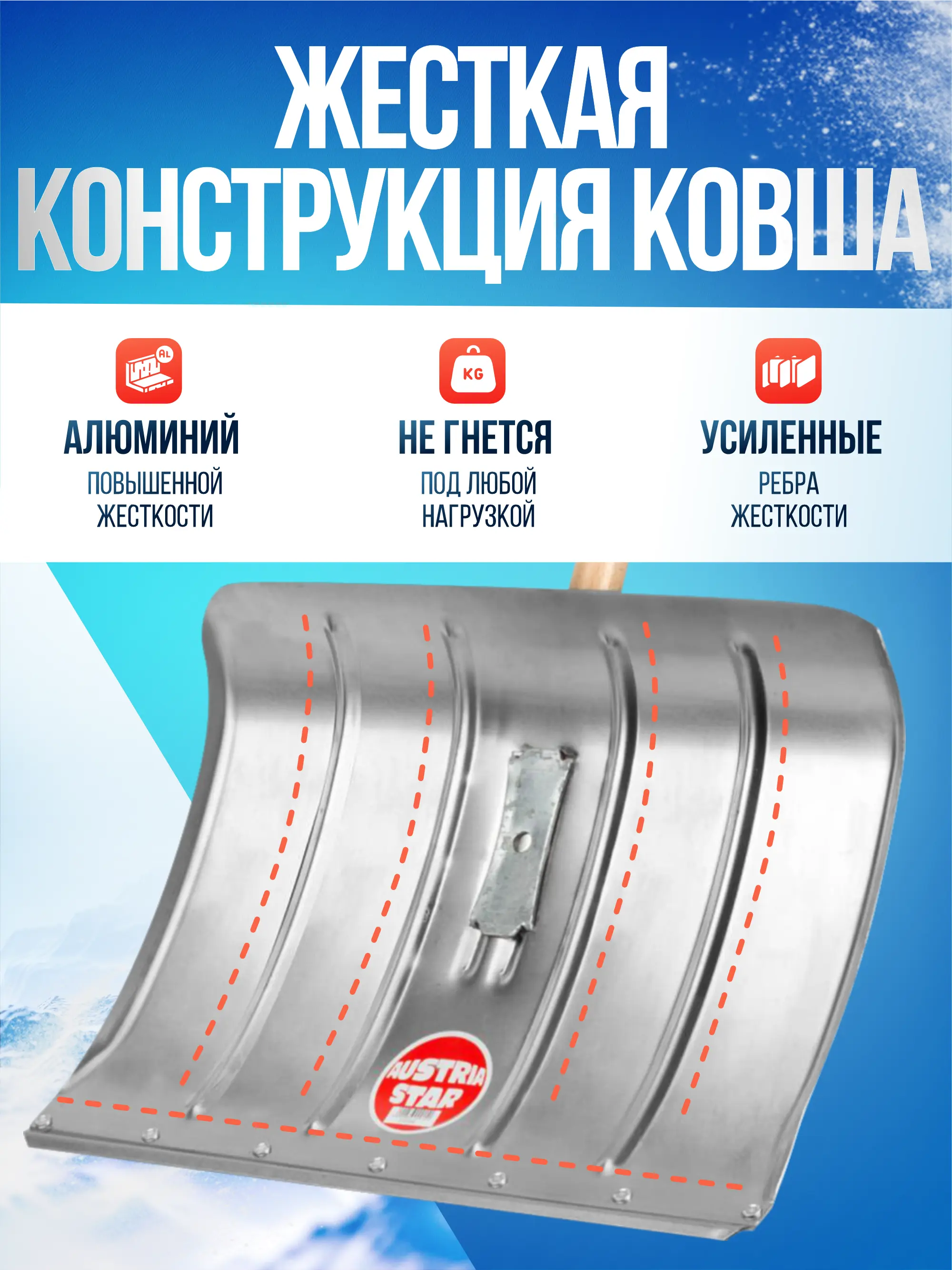 Алюминиевый ковш 2 мм + стальной кант — уверенная работа по плотному снегу и наледи. Производство — Австрия.