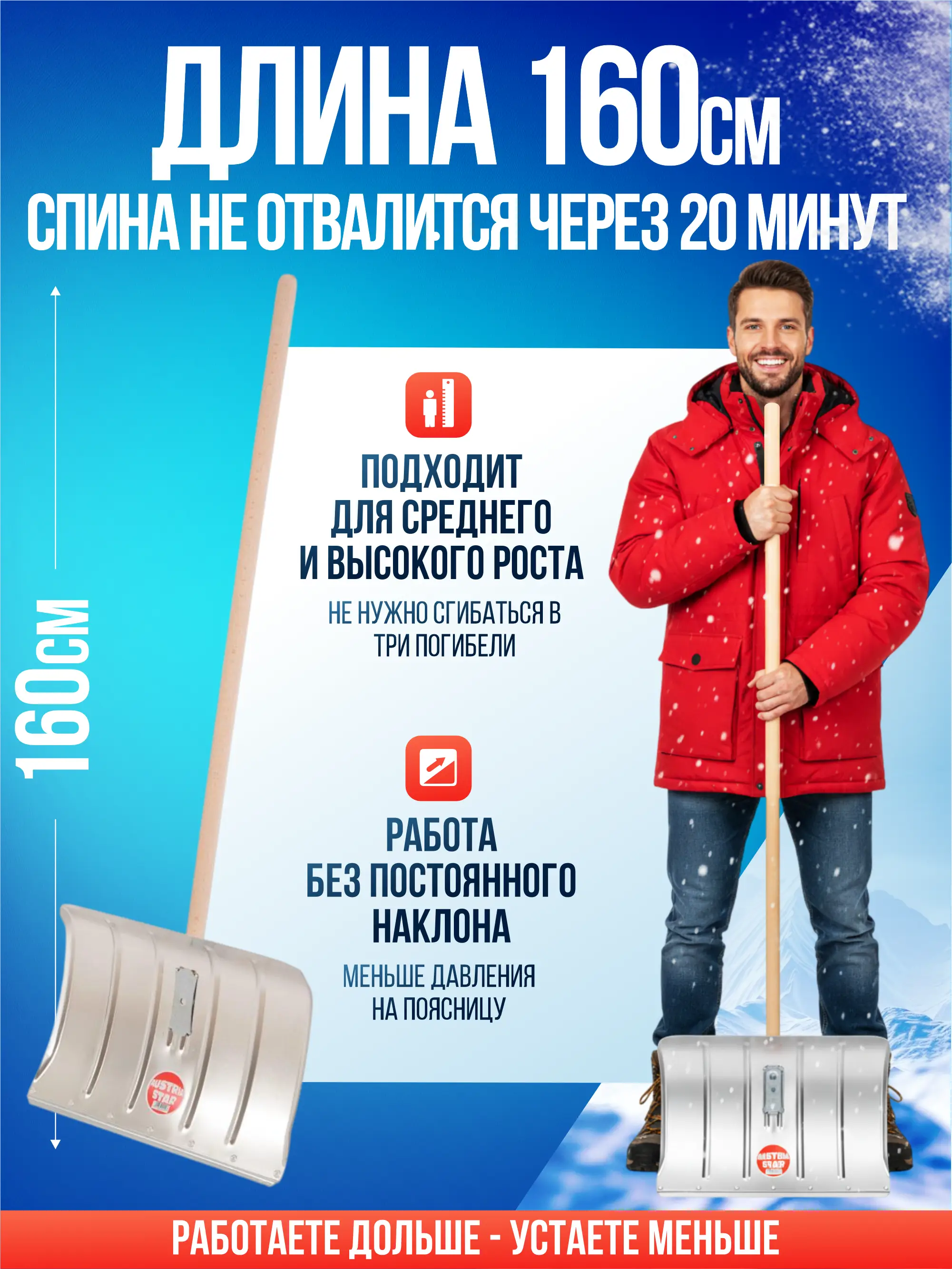 Общая длина 160 см, рукоятка 127 см. Можно работать стоя — меньше нагрузки на поясницу.