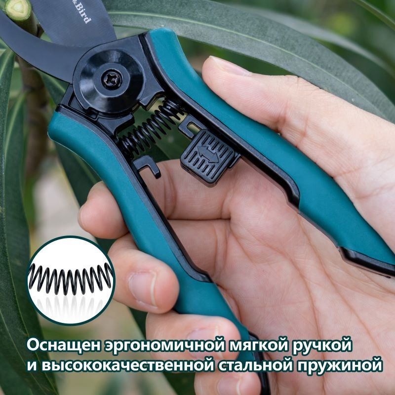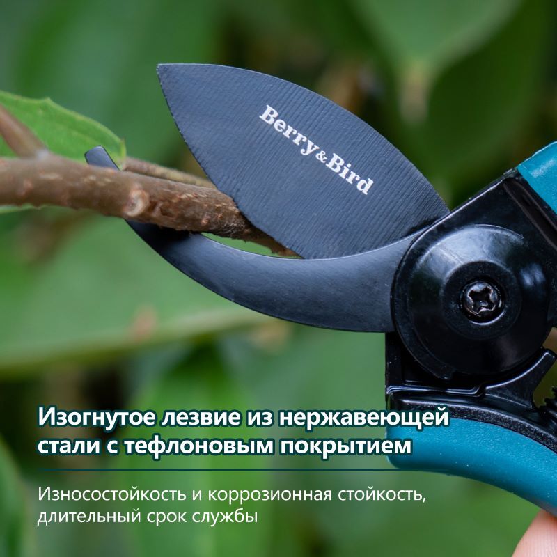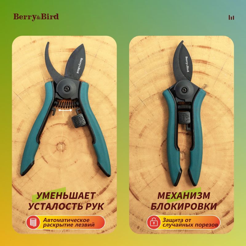 Секатор Berry&Bird — ваш надежный помощник в саду, сочетающий комфорт и профессионализм. Эргономичная нескользящая ручка и автоматическая пружина снижают нагрузку на руки, делая работу легкой даже при длительном использовании. Острые нержавеющие лезвия режут ветки до 0,38 см точно и без заусенцев, сохраняя здоровье растений. Встроенный предохранительный замок обеспечивает безопасное хранение, а универсальность инструмента покрывает все задачи от обрезки цветов до сбора урожая. Позаботьтесь о своем саде с удовольствием!