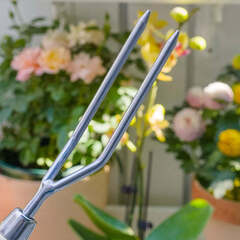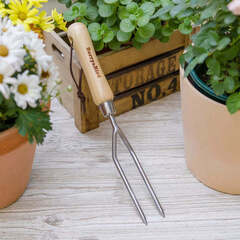 Садовая ручная вилка с двойными зубьями. Подходит для пересадки в ограниченном пространстве, рыхления почвы на небольших участках, разрушения твердых почвенных блоков и повышения проницаемости почвы.